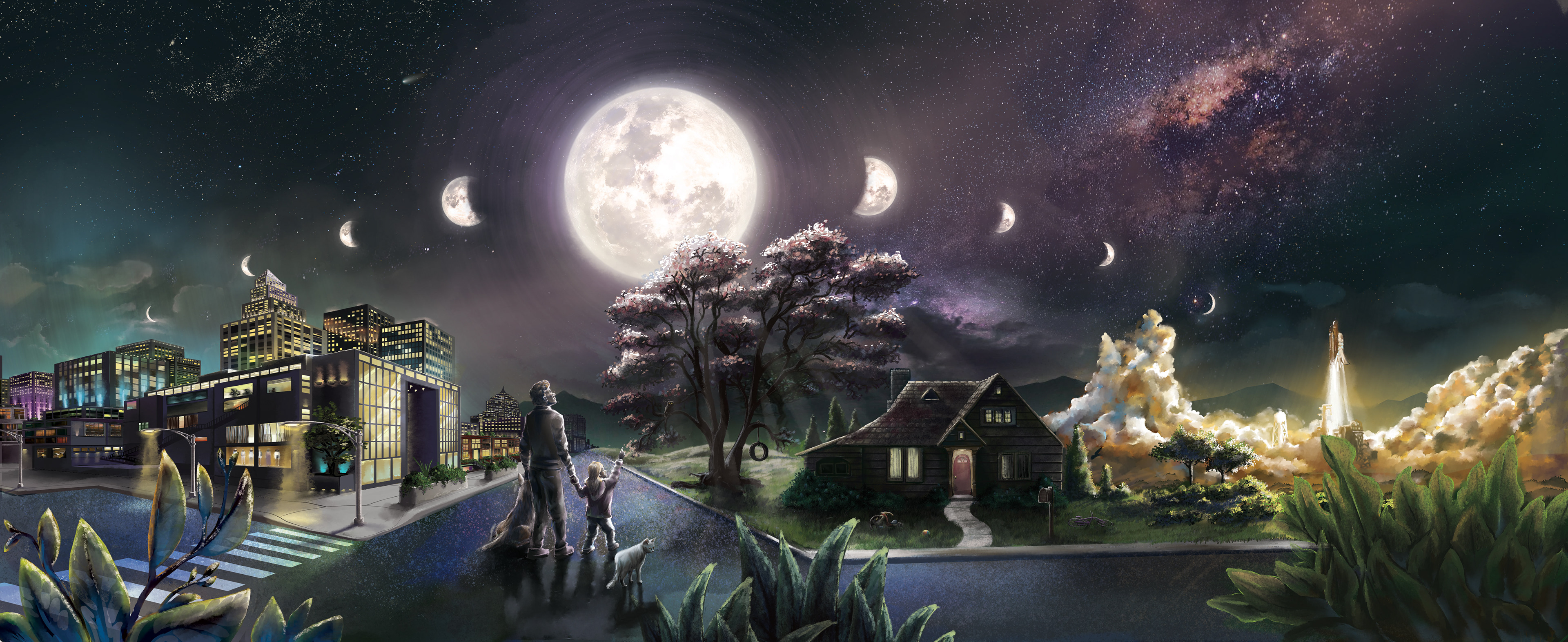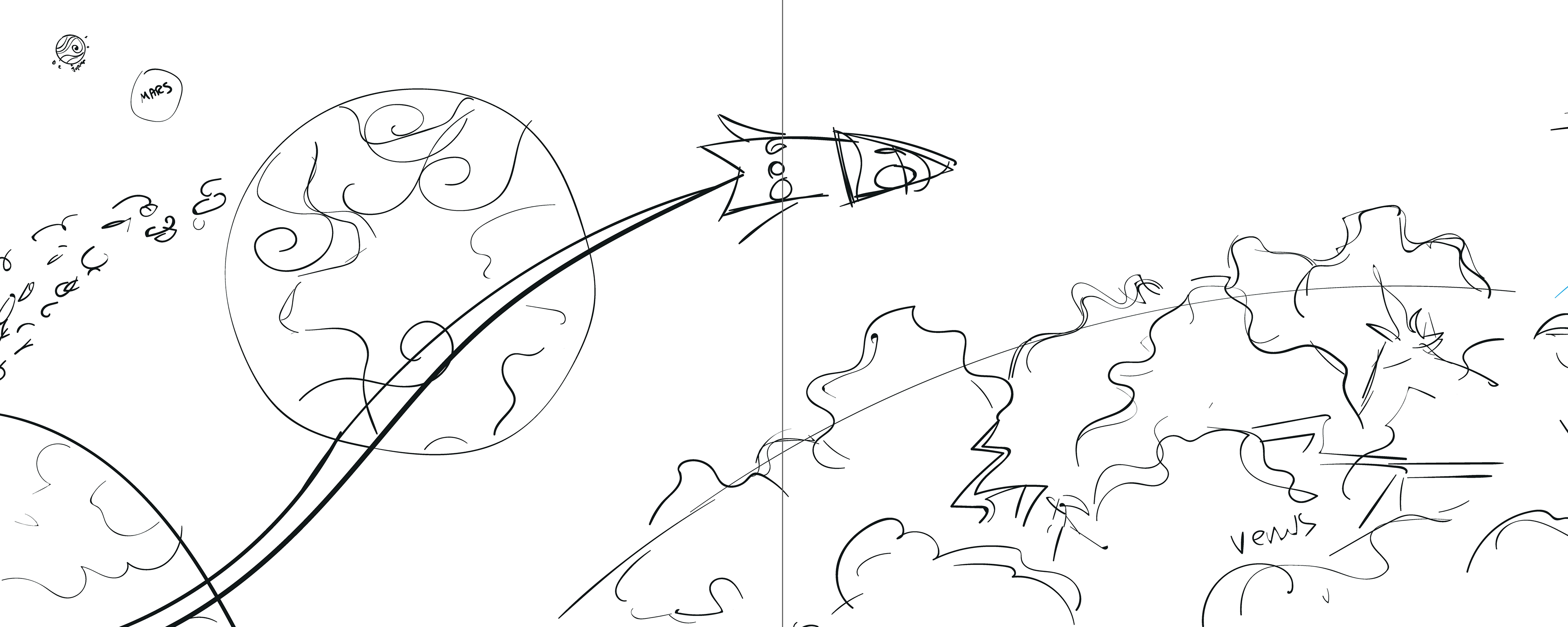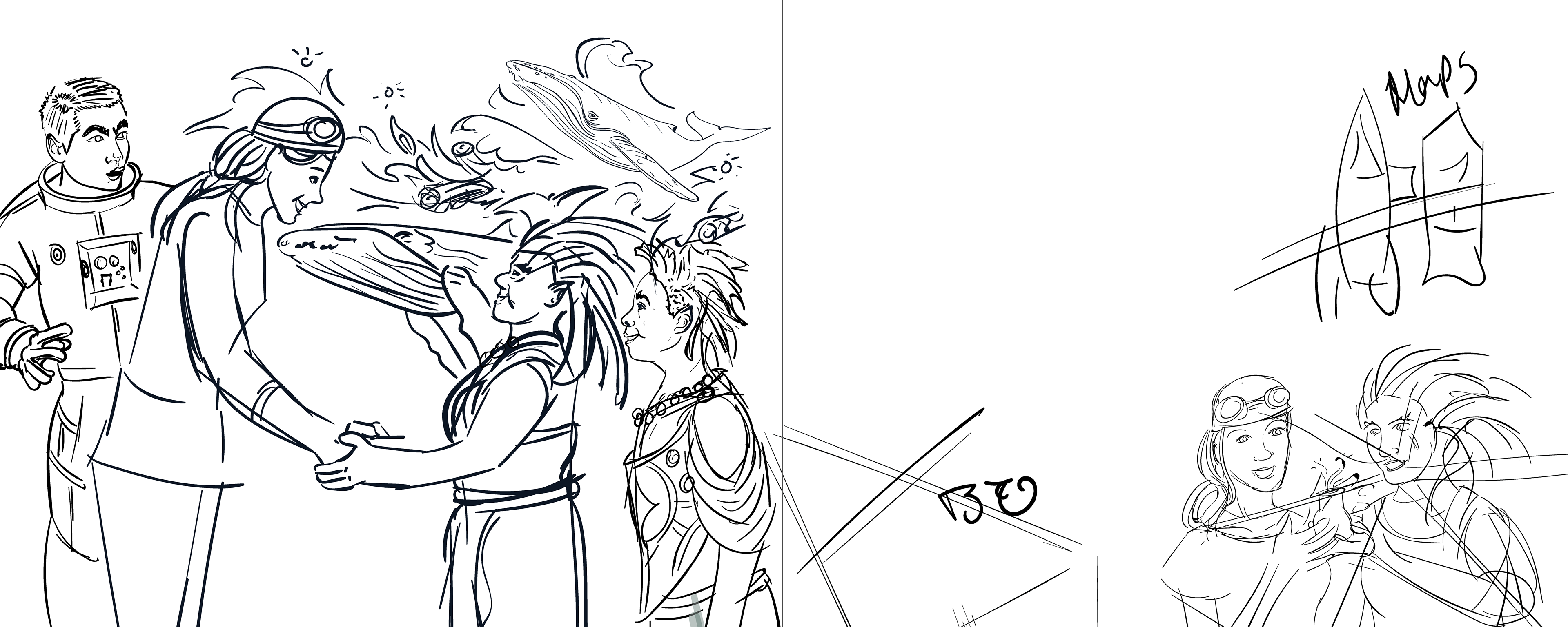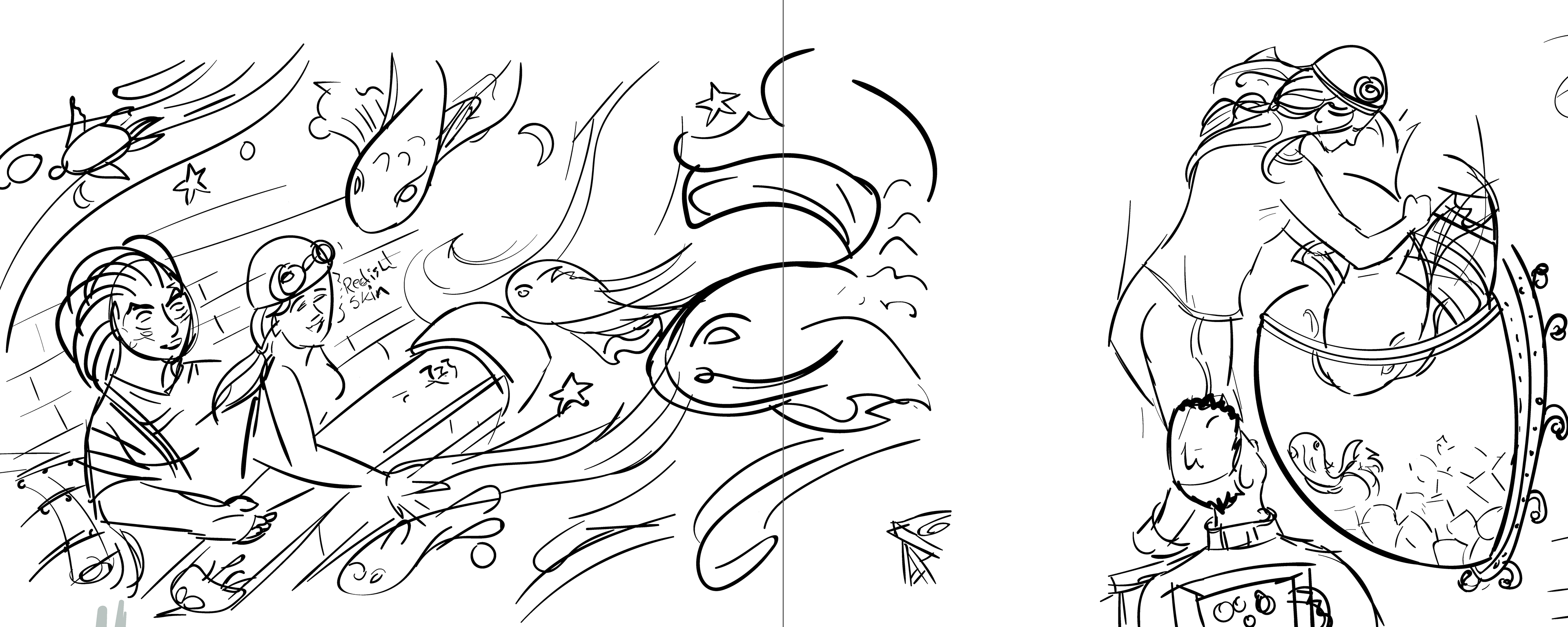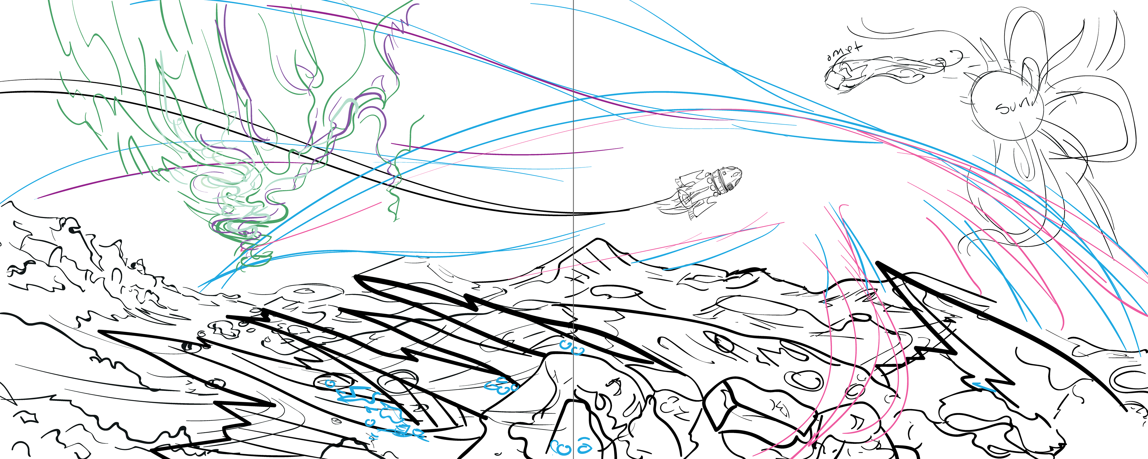 These are all very basic questions facing an illustrator. How you approach your process is all very personalized, however I started with basis sketches. Then, I photoshop references onto the sketches to get my base layer. From there I illustrate my primary strokes, defining the palette for each spread, and sketching in any details that I want to swing back around to in the final pass. And then polish polish render with every stroke of the stylus.