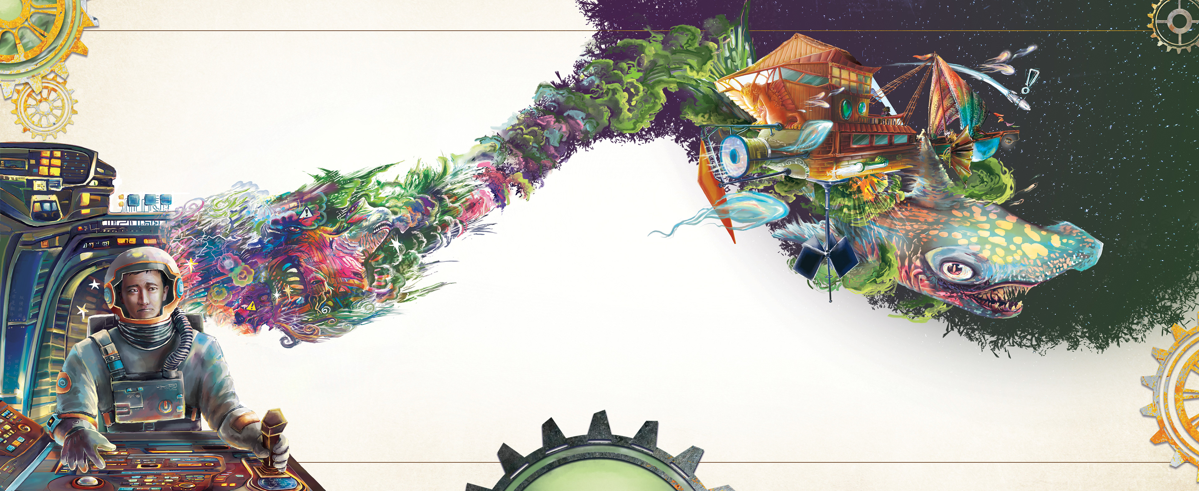 A scene from later in the picture book where Luna and her earthling friend Bae encounter the people who catch solar fish near the heat of the sun....